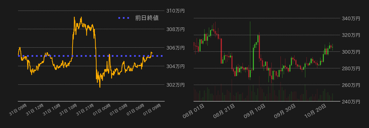 10月31日のビットコイン(BTC)対円相場は、外国為替市場でのドル円相場の上昇の恩恵を受け小幅上昇。対ドルでは小幅に下落した。東京時間のこの日の相場は、概ね304万円周辺で揉み合いが続いたが、一部アルトコイン相場の上昇に連れて308万円に乗せた。一方、米連邦公開市場委員会(FOMC)を控え米株式市場が安寄りして始まると、BTCは一気に下げ足を速め302万円を割り込んだ。この日はマイニングのアルゴ・ブロックチェーン(ARB)が資金調達に失敗し株価が暴落したこともBTC相場の重石となった。ただ、その後は頭打ちの様相を呈していたビットコインのハッシュレートが急上昇し、日時平均で初めて300Ehash/s台に乗せたこともあり、相場は底堅く推移。米長期金利がこの日の高値から反落したことも追い風となり、ジリ高に転じた。