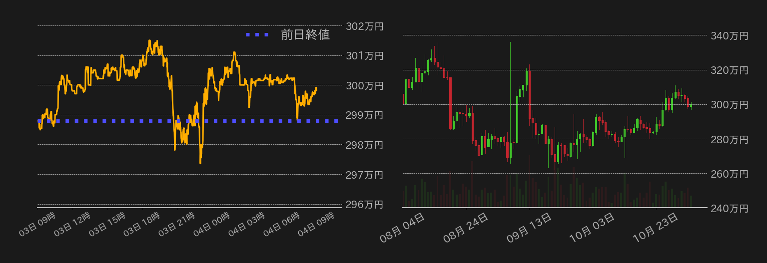11月の米連邦公開市場委員会(FOMC)の結果を受けて、週央からのビットコイン(BTC)対円相場は動意含みからやや弱含む展開となり、300万円を割り込んだ。3日未明に発表されたFOMC声明では、ラグを伴う金融引き締めの累積効果を考慮するとの旨が記され、ハト派に捉えられたが、その後のパウエル米連邦準備制度理事会(FRB)議長の記者会見で、ターミナルレートが9月のFOMCの想定を上回る可能性があるとの発言があり、BTCは乱高下の末297万円近辺まで下落。3日の東京時間には戻りを試したが、米国債利回りの上昇に上値を抑えられ反落。米供給管理協会(ISM)の発表する10月の非製造業景気指数(PMI)が9月から低下したことで、相場は一時反発するも、市場がFOMCの結果を消化する中、上値は限定的だった。