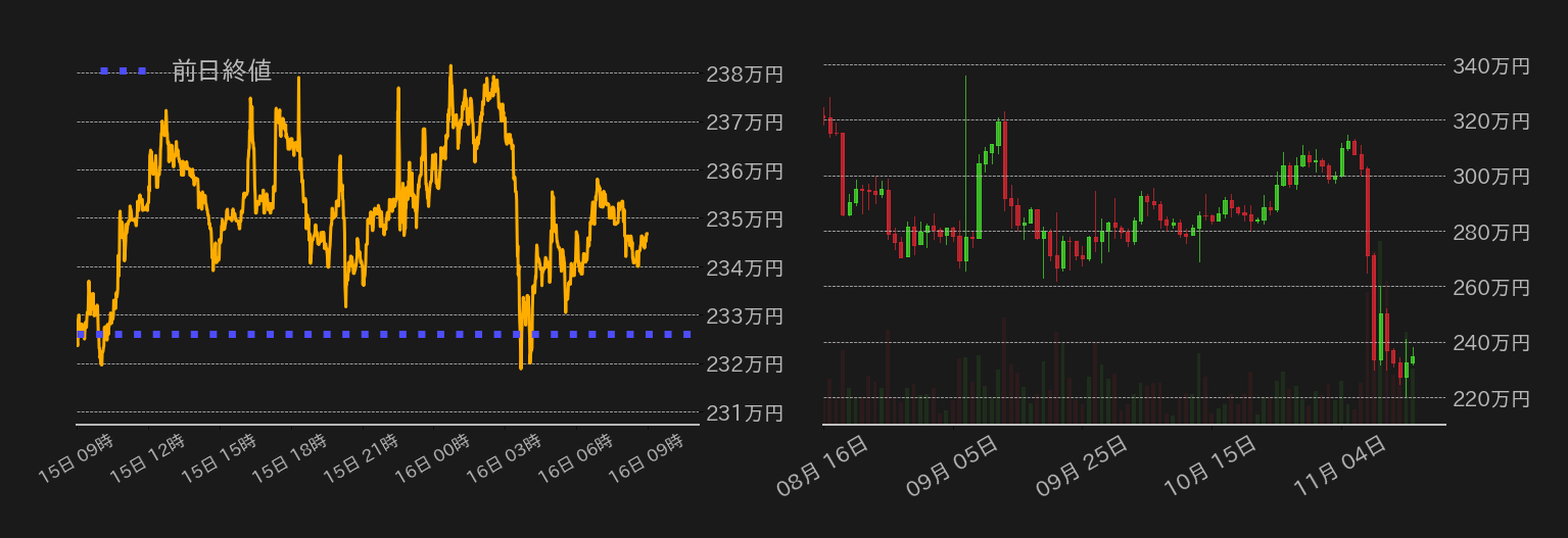 15日のビットコイン(BTC)対円相場は230万円台で小幅に続伸。週明けの踏み上げによる相場反転と、バイナンスの「業界復興基金(Industry Recovery Fund)」設立により市場のムードが少しづつ押し上げられ、昨日の東京時間のBTCは小確り。注目された10月の米卸売物価指数(PPI)は予想を下回る上昇率となり、相場は一時17,000ドル水準(≒237.6万円)を回復したが、米国債利回り急低下によるドル円相場の下落でBTC対円は上げ幅を圧縮された。一方、米市場後半にはロシア軍のミサイルが北大西洋条約機構(NATO)加盟国のポーランドに着弾したとの報道がリスクオンムードに冷や水を浴びせ、BTC相場は米株の反落に連れ安。足元では前日終値近辺で反発しているが、終値での節目17,000ドル水準回復に失敗した。