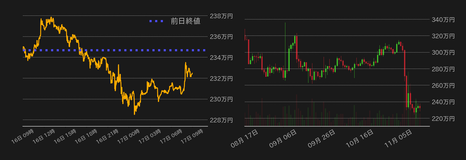 16日のビットコイン(BTC)対円は、東京時間序盤に17,000ドル水準(≒237万円)にワンタッチすると失速。BlockFiの破産申請準備報道もあり、その後は戻り売りが入り230万円台前半まで押すと、Genesisの新規ローン組成と償還の一時停止や、それを受けたGeminiの利付き口座からの出金停止、さらには予想を上回った10月の米小売売上高を受け下げ足を速め、228.5万まで下げ一色となった。一方、対ドルで16,400ドルとなる同水準で相場は下げ止まると、今朝方には押し目買いの様相で反発し下げ幅を縮小。終値ベースで230万円台を維持した。米小売売上高は1.3%上昇と予想の1%を上回った一方、小売大手のターゲット(TGT)が、年末商戦を控える第四・四半期の業績見通しに懸念を示したことで複雑な状況を描いた。