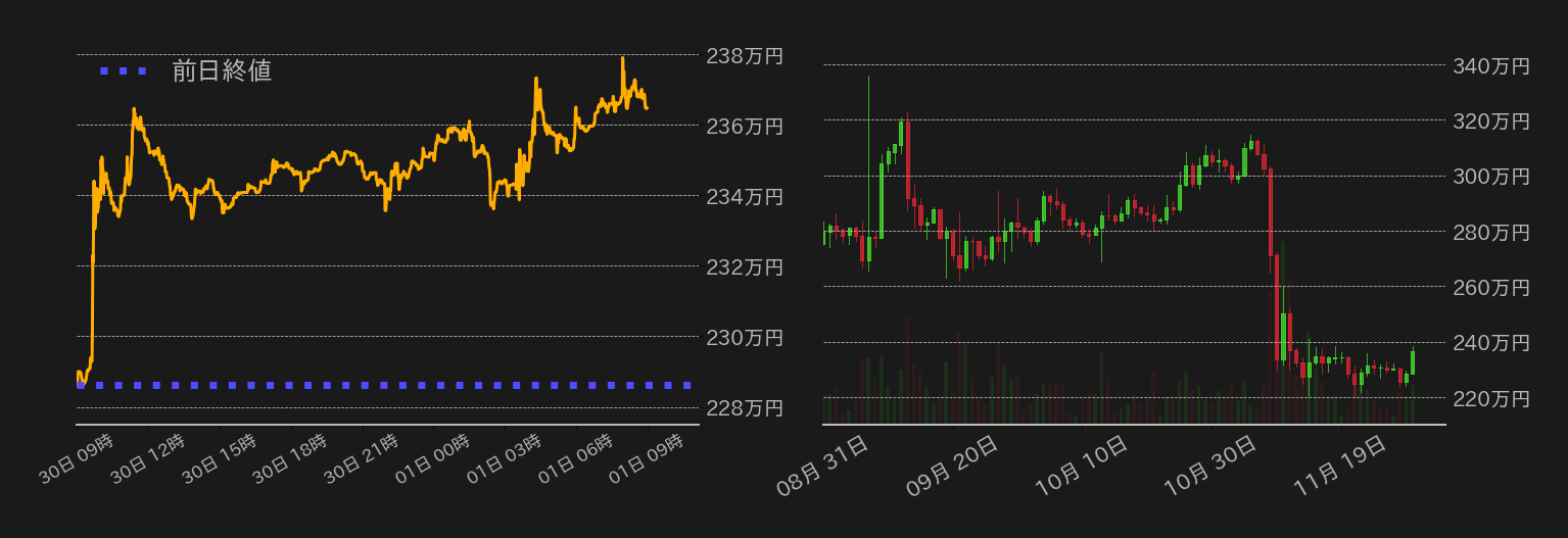 11月30日のビットコイン(BTC)対円は、東京時間にドージコイン(DOGE)やイーサ(ETH)の上昇に連れ高となり230万円台中盤に戻すと、その後は米経済指標を待ち受けるように同水準で揉み合いに終始。米国朝方に発表されたADP雇用レポートでは、雇用者数が前回の23.9万人から12.7万人と市場予想(20万人)も大きく下回り相場は動意付いたが、直後に発表された第三・四半期GDP成長率が予想を上回り上値を抑えられた。一方、警戒されていたパウエル米連邦準備制度理事会(FRB)議長の発言では、早くて12月に利上げペースを減速させる可能性が明言された他、米地区連銀経済報告で経済成長や物価上昇ペースの鈍化が示唆され、BTCは上値を追う展開となった。BTC対ドルは節目の17,000ドル(≒232.6万円)を回復した一方、ドル円相場の下落を受けてBTC対円は終値にかけて上げ幅をやや縮小した。