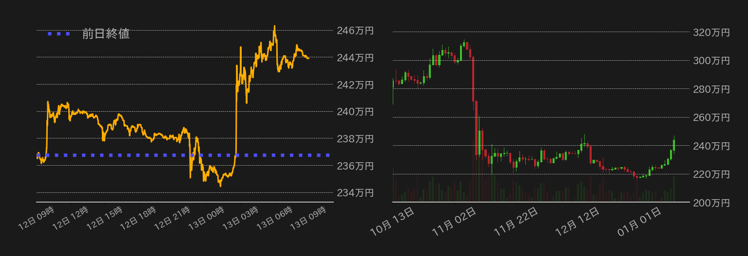 12日のビットコイン(BTC)対円相場は5日続伸し、240万円を昨年11月10日ぶりに終値で回復。ドル建てでは18,000ドル(≒232.4万円)を回復している。この日のBTC相場は始値が付いた直後に一段高を演じ18,000ドル水準を回復すると、239万円近辺で揉み合いに転じた後、ドル円相場の下落に伴いジリ安となり238万円割れを試した。注目された12月の米消費者物価指数(CPI)は、市場予想と合致し前年比で11月の7.1%から6.5%に減速。月次では0.1%から-0.1%と下落した。結果を受けてBTC相場は一時乱高下するも、その後の米国利回りの急低下に逆行高となり、一時は246万円を回復した。
