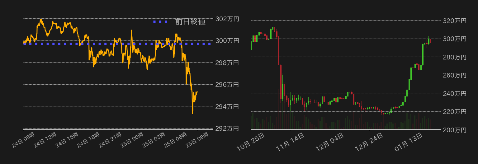 24日のビットコイン(BTC)対円は反落し、対ドルで節目23,000ドル水準となる300万円の終値での回復にまたも失敗した。アルトコイン高に連れて東京時間には300万円を回復する場面も見られたBTC相場だったが、海外時間に入るとアルトに利食いが入り小甘い推移に転じ、300万円を下回った。注目されたS&Pグローバルの1月米購買担当者景気指数(PMI)は総合、サービス、製造業のいずれも50を割り込んだものの、12月からは僅かに改善し安寄りした米株の支えとなり、BTC相場も298万円から小幅に反発した。一方、まちまちの米企業決算を受け米株が足踏みとなると、BTC相場は節目300万円で失速。今朝方には再び利食いと思われる売りが入り上値を重くしている。