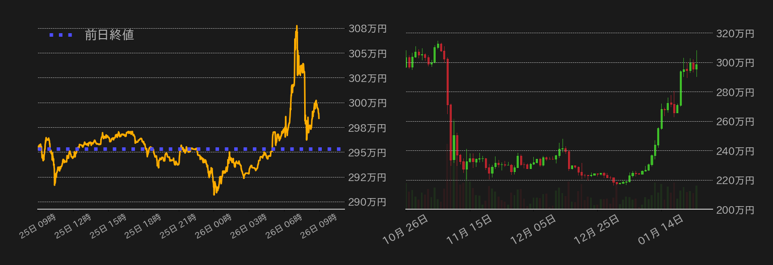 25日のビットコイン(BTC)対円は反発。対ドルでは23,000ドル(≒297万円)を終値で回復したが、円高の影響でBTC対円は上昇幅を圧迫された。昨日朝方に発表されたマイクロソフトの決算が今一つだったことで米株先が軟化したことを受け、東京時間のBTCも上値を重くした。一方、相場はドル建てで、日曜日安値(22,300ドル≒288万円)近辺で短くダブルボトムを形成すると、米株の戻りに連れ高となりネックライン(297万円)の上抜けに成功。この日はカナダ中銀(BoC)が主要国としては初めて利上げの一時休止を表明した。今朝方にはテスラの決算で、同社がBTCを追加売却していなかったことが明らかとなり、BTC相場は一時308万円まで上値を伸ばしたが、すかさず売りが入りほぼ全値押しとなった。