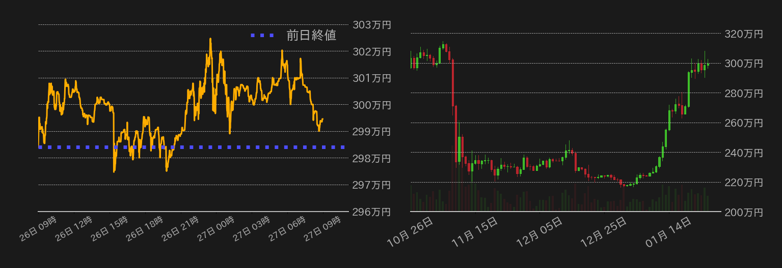 26日のビットコイン(BTC)対円は300万円周辺でほぼ横ばい。米国の2022年第四・四半期GDP成長率の発表を控え、東京時間のこの日のBTCは300万円前後で揉み合いに終始。米GDPは前期の3.2%から2.9%に減速したものの、市場予想の2.6%を上回り底堅さが示されたが、失業保険新規申請件数が市場予想を下回り労働市場の逼迫継続が示唆された。まちまちの結果となった経済指標を受け、BTC相場は一時302万円にタッチしたが上値を伸ばせず、結局はっきりと方向感を示せず299.4万円で終値を付けた。
