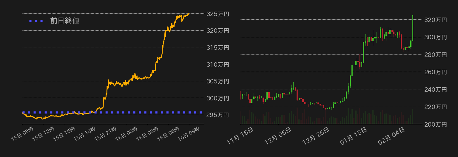 15日のビットコイン(BTC)対円は急伸し、295万円から325万円まで上値を伸ばした。14日に発表された1月の米消費者物価指数(CPI)は、前年比で市場予想を上回る結果となったが、米株の底堅い推移を味方にBTCは反転し22,000ドル(≒294.7万円)を回復。ジョージ・ソロスのヘッジファンドが暗号資産(仮想通貨)関連銘柄へのエクスポージャーを増やしたことも材料視された模様だ。昨日も1月の米小売売上高やNY連銀製造業景気指数が市場予想を上回り、米国債利回りとドルが上昇する中でBTC相場は上伸。ドル建てでは、24,000ドル(≒321.5万円)を回復し、終値で今月高値を僅かに上回った。