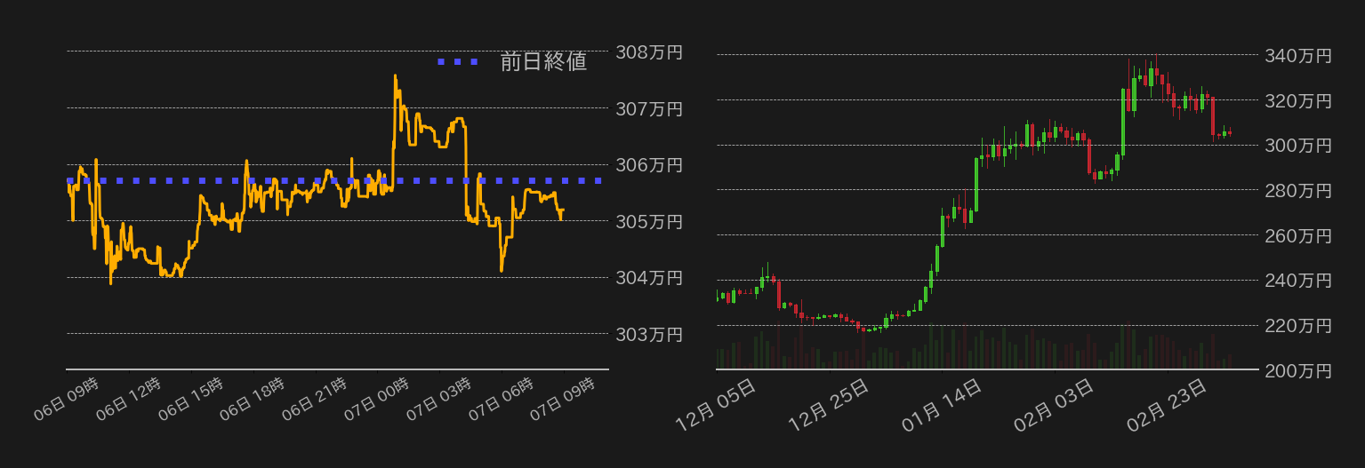 6日のビットコイン(BTC)対円は300万円台中盤での揉み合いに終始。米銀行持株会社シルバーゲートの破産懸念から3日に相場水準を下げたBTCだったが、対ドル相場で1月18日安値と2月13日安値を基点とする上昇トレンドが走る約22,000ドル水準(≒301.6万円)で下げ止まると、下げ一服感から300万円台中盤で底堅い推移に転じた。6日のBTC相場も同水準周辺で小動きに終始。7日〜8日にかけてのパウエル米連邦準備制度理事会(FRB)議長の議会証言を前に様子見ムードが広がった。米時間には、米主要3株価指数の上昇に連れて一時買われる場面もあったが、その後の下落に連れて上げ幅を掻き消した。