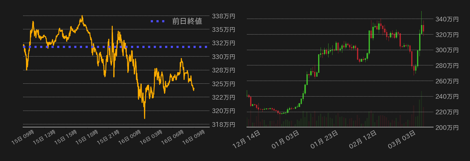 15日のビットコイン(BTC)は反落し、330万円台の維持に失敗。米中堅銀行の先行きを巡る懸念が後退し、2月の米ヘッドラインCPI(消費者物価指数)が上昇ペースを再び減速させたことで、一時は9ヶ月ぶりの高値(354.5万円)を付けた今週のBTCだったが、コアCPIが月次で加速したことで、来週の米連邦公開市場委員会(FOMC)での金利据え置き観測が後退し、上げ幅を縮小していた。昨日の相場は、330万円台で小確りとした動きとなったが、クレディ・スイスの筆頭株主であるサウジ・ナショナル・バンクが、同行への追加投資を見送ったことで、本格的且つ世界的な金融ショックを想起させ、同行の株価を筆頭に欧州銀行株が急落し始めると、BTCも上値を圧迫された。その後、2月の米生産者物価指数(PPI)の伸び減速で持ち直すも、寄付きの米株市場が軟化し反落。ただ、FOMCでの金利据え置き観測が再び台頭したことで相場は24,000ドル水準(≒319万円)反発している。