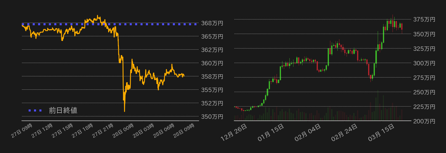 27日のビットコイン(BTC)対円は高値圏で反落し、今月18日ぶりに350万円台で終値を付けた。ドル建てで節目の28,000ドル回復を試す展開で始まった今週の相場だったが、米地銀ファースト・シチズンズ・シェアーズがシリコンバレー銀行の預金や一部資産を米連邦預金保険公社(FDIC)から取得したことで、安心感から米国債利回りが上昇すると、BTCは上値を重くした。米銀行システムへの懸念後退から、その後は米株先の上昇に支えられる場面もあったが、バイナンスとCEOのCZが米商品先物取引委員会(CFTC)から提訴されたことで相場は下げ足を速めた。一方、高値レンジ下限近辺で相場は買い支えられ、終値では27,000ドル水準となる354.5万円を死守した。