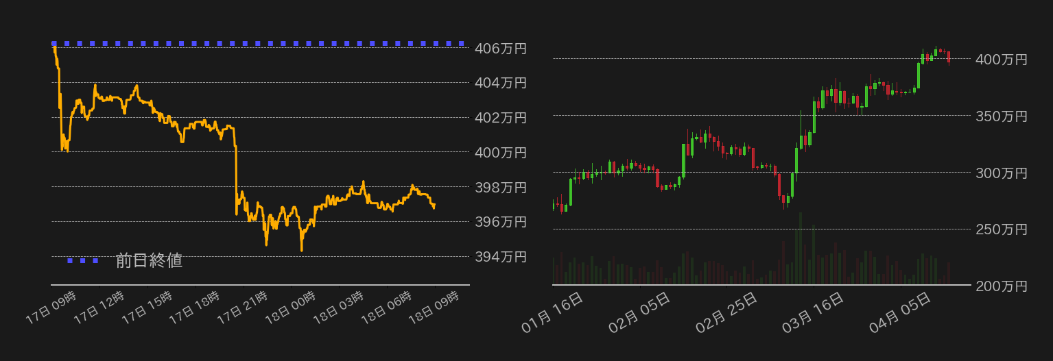 17日のビットコイン(BTC)対円は続落し、400万円台の維持に失敗した。先週のイーサリアムの上海アップグレード通過後の買いが一巡し、昨日は東京時間からETHを筆頭に利食いが入り、BTCは400万円割れを試す展開で始まった。欧州序盤まではドル建てで節目の30,000ドル水準となる403万円周辺で下げ渋るも、暗号資産(仮想通貨)関連サービスを提供する米ステート・ストリート銀行の決算不振を受けてもう一段と下げ400万円を割ると、米国債利回りの上昇が相場の重石となり394万円まで押した。一方、昨日の米株式市場では、金融、不動産、工業セクターが買われ主要3指数が底堅く推移し、米時間のBTCは390万円中盤で下げ止まった。
