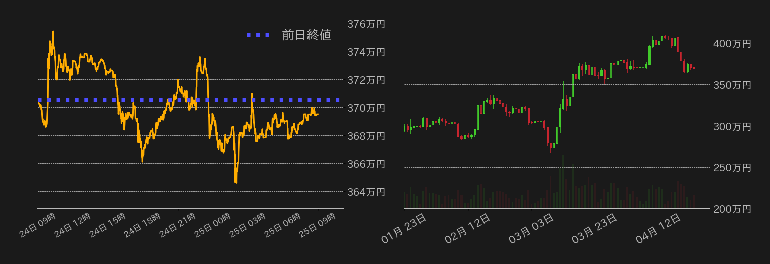 24日のビットコイン(BTC)対円相場は370万円付近でほぼ横ばい。東京時間に一時戻りを試したが、ドル建てで節目の28,000ドル水準となる375.5万円で上値を抑えられると、米株先の下落が相場の重石となり反落。欧州時間には、今夏に半減期を控えるライトコイン(LTC)の相場が上昇し、BTCも連れ高で切り返したが、マイクロソフトやアルファベットといった大手IT企業の決算を控えるなか、米市場序盤にテック株を中心に売りが広がるとBTCも再び反落した。しかし、相場は27,000ドル水準となる364万円で反転すると、米主要株価3指数が後半に切り返したことも支援となり、370万円近辺まで戻した。