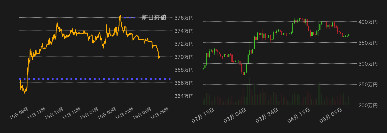 15日のビットコイン(BTC)対円は上昇し、4日続伸した。週末は360万円台中盤で動意に欠ける展開が続いたBTC相場だったが、この日はアップデートを控えたビットコイン・キャッシュ(BCH)の他、ライトコイン(LTC)相場を筆頭に東京時間から強含み、BTCも連れ高で370万円台に乗せると、米時間まで小確りと推移した。BCHはアップデート通過後から売られたが、BTCは米株の反発を味方につけ底堅い推移で376万円にタッチ。一方、米市場後半にはBCH相場の下落が市場全体の重石となりBTC相場も小緩むと、終値にかけて上げ幅を縮小した。