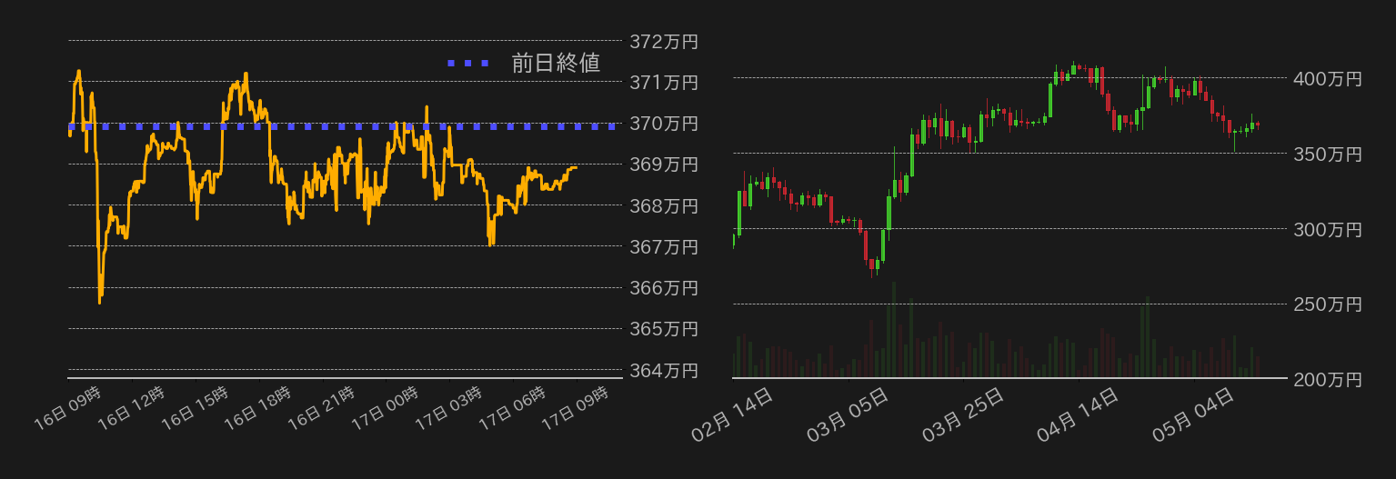 16日のビットコイン(BTC)対円は小幅に反落。ビットコイン・キャッシュのアップデート通過後のアルトコイン相場の失速に連れて週末からの上げ幅を縮小したBTC相場は、昨日の東京時間にも365万円まで一段と下落した。これによりドル建てで節目の27,000ドル(≒368.3万円)を割った相場は、一時は買い戻され反発するも、欧州連合(EU)各国の財務大臣らが圏内の包括的な規制フレームワーク(MiCA)に署名したと報じられると反落。節目の水準では買い支えられるも、米株の軟化が上値を圧迫し、27,000ドル水準を挟み込み揉み合う展開となっている。