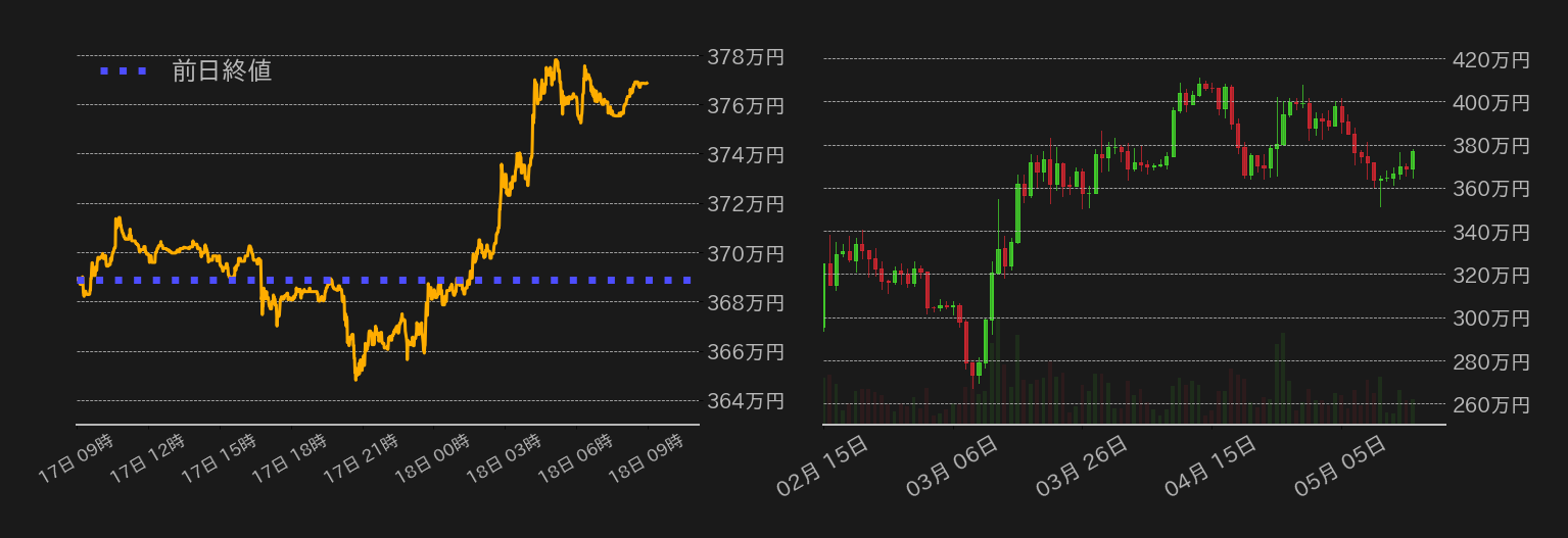 17日のビットコイン(BTC)対円は反発し、先週の下げ幅の半分を奪回した。27,000ドル水準(≒371.5万円)での揉み合いが続いたBTC相場だったが、この日は前日に急伸したXRPやライトコイン(LTC)に利食いが入り小緩むと、東京時間に370万円周辺で失速。欧州序盤から売りが加速し一時は364.7万円まで押した。一方、米債務上限問題を巡り、この日はマッカーシー(共)下院議長が今週中の合意が可能と発言したことで、米株式市場が急反発。BTCも米株に連れ高となると同時に、ドル高円安の恩恵を受け、今週の高値を更新した。