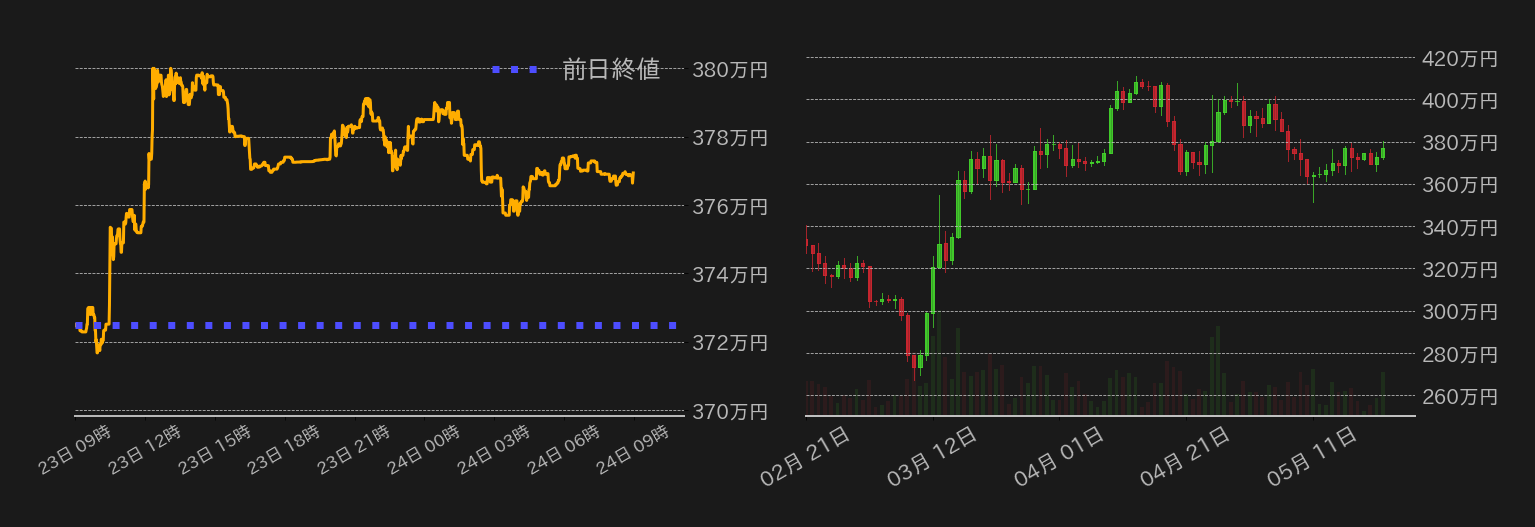23日のビットコイン(BTC)対円は続伸し、ドル建てで27,000ドル水準となる374万円を回復した。香港で来月1日から施行される暗号資産(仮想通貨)新規制において、BTCとイーサ(ETH)が取引所への上場可能な銘柄の条件を満たすことが示され、BTC相場は東京時間に一段高を演じ27,000ドル水準を上抜け380万円にタッチした。一方、この日はバイナンスが2020年から2021年にかけて自己資金と顧客資金を混同して運用していたとのロイターの報道や、米債務上限を巡る協議に進展がなかったことで米株が軟化し、相場は海外時間から上値を重くし上げ幅を縮小した。
