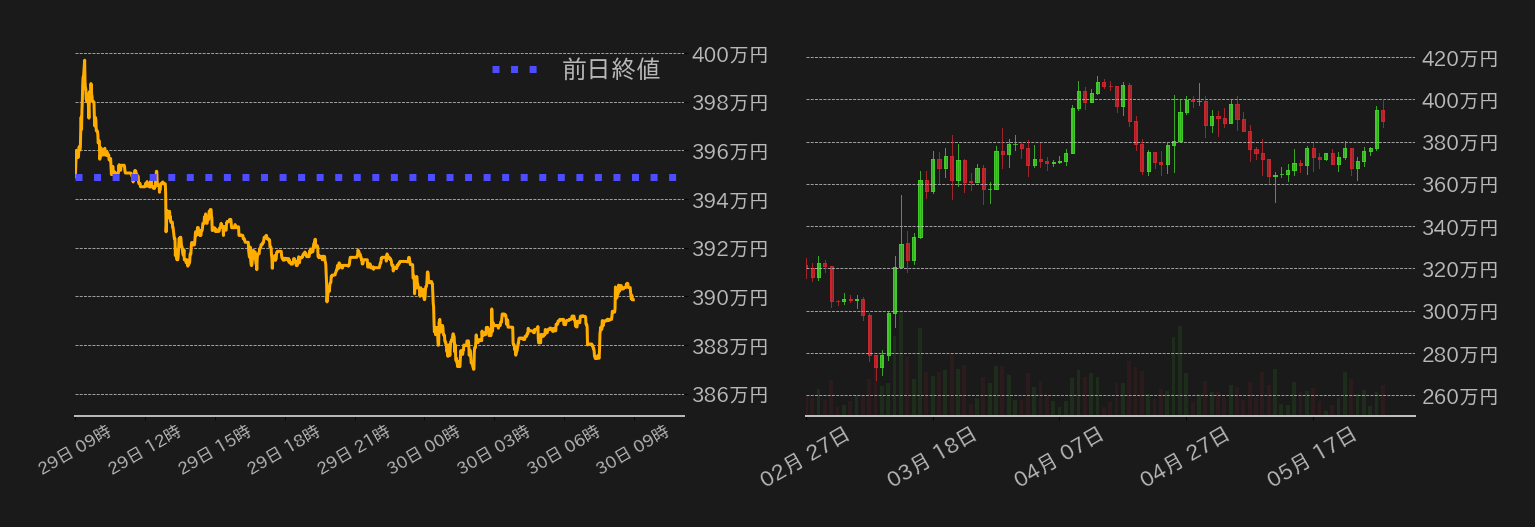 29日のビットコイン(BTC)対円は反落し、ドル建てで28,000ドル水準となる392万円の維持に失敗した。週末に米債務上限引き上げが暫定的に合意され、390万円を3週間ぶりに回復したBTC相場だったが、昨日は東京時間に400万円にワンタッチすると反落し390万円台前半でジリ安に転じた。この日は目星い材料に乏しく、米英市場も休場となったことで様子見ムードが広がるなか、一部の共和党保守派議員から債務上限引き上げを巡る合意に反対する声も散見され、BTC相場は米時間序盤に390万円を割ったが、ドル建てで先週火曜日の高値となる27,500ドル(≒385万円)近辺がサポートとなり下げ止まった。