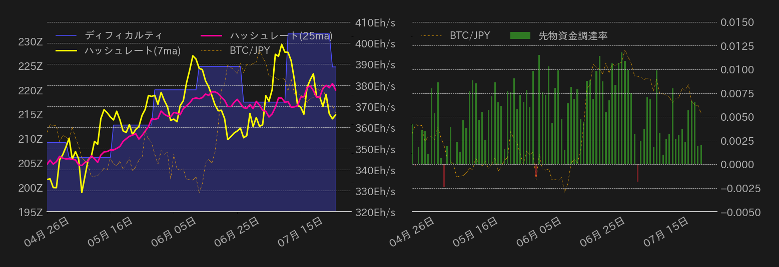 FOMC後の記者会見でパウエル米連邦準備理事会(FRB)議長が、FRBメンバーは景気後退を予想していないと発言した矢先、昨日は第二・四半期国内総生産(GDP)速報値が前期比2.4%上昇し(市場予想:1.8%)、新規失業保険申請件数も前週比で7,000件減少した。一方、第二・四半期の個人消費支出(PCE)価格指数の速報値は、第一・四半期の4.1%から2.6%に鈍化、同コア指数も下振れとなっており、今夜発表される6月のPCE価格指数もインフレ抑制傾向を示す結果が期待される。他方、本日の日銀政策決定会合では上述の通り、長期金利上限の超過を容認する可能性がある他、米PCE価格指数が下振れとなればドル円相場には重石となることが指摘され、円建てBTCには向かい風となろう。