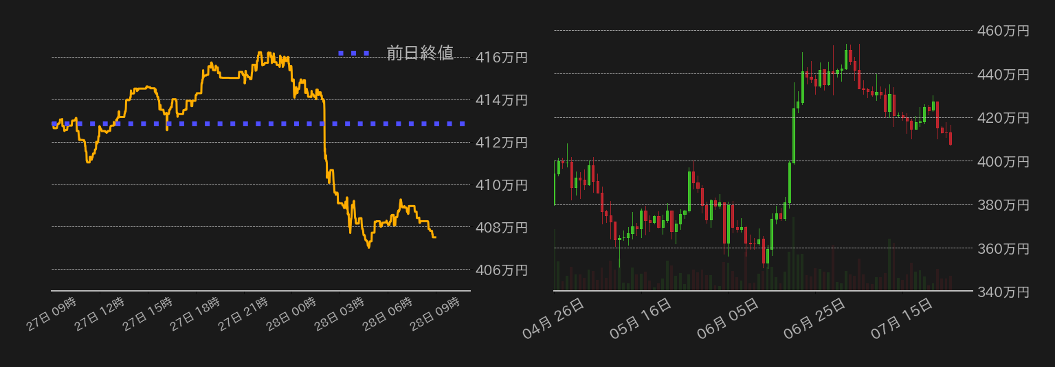27日のビットコイン(BTC)対円は4日続落し、先月20日ぶりに終値で410万円を割り込んだ。今一つ手掛かりに欠ける米連邦公開市場委員会(FOMC)を通過し、東京時間のこの日のBTCには買い戻しが入った他、一部アルトコインの上昇も追い風となり、相場は一時416万円を回復した。この日開催された欧州中央銀行(ECB)理事会では、予想通り25ベーシスポイント(bp)利上げが決定され、次回9月会合は「データ次第」と金利を据え置く可能性も示されたが、その後発表された一連の米経済指標が強めに出たことでBTCは反落。更に、日銀が市場の動きに応じて長期金利上限の超過を容認する可能性が浮上していると日経電子版が報じると、ドル円相場が急落し、円建てBTC相場の重石となった。