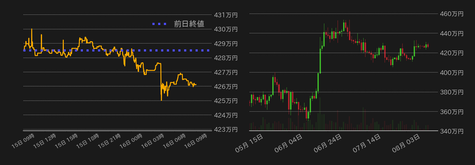 15日のビットコイン(BTC)対円は反落し、週明けの上げ幅の殆どを縮小した。東京時間のBTCは430万円手前で揉み合いに終始。欧州勢参入後にドル円相場が小高く推移したことで、円建てBTC相場も小幅に上昇したが、本邦当局による為替介入への警戒感からドル円相場は失速すると、BTC対円は上げを掻き消した。この日発表された7月米小売売上高は市場予想を上回り、米金利高止まりの長期化観測が台頭。加えて、米格付け会社フィッチのアナリストが、複数の米銀行を格下げする可能性を警告したことで、昨日は銀行株を中心に米株が軟化し、米時間のBTCは428万円を割り込み、安値425万円まで押した。