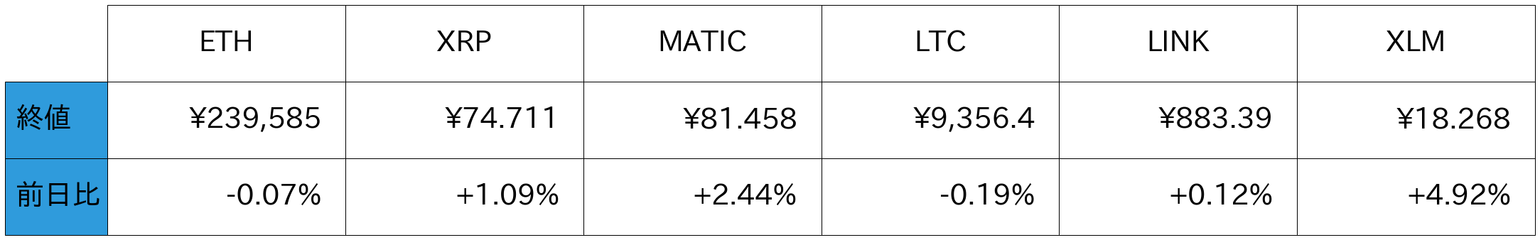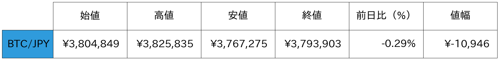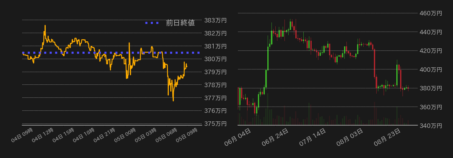 4日のビットコイン(BTC)対円は概ね横ばい。週明けの東京時間の相場は、取引材料に乏しく380万円周辺での揉み合いに終始。昨日は中国が不動産業界を対象とした追加刺激策を発表したことで安全資産とされる金(ゴールド)の相場が軟化し、BTC対ドルも欧州時間にやや軟化したが、BTC対円の下げはドル円相場の上昇で相殺された。米時間には、オンライン暗号資産(仮想通貨)カジノの「ステーク」がハッキングに見舞われ、4000万ドル相当のアルトコインが不正流出したと報じられたが、相場への影響は軽微だった。今朝方の相場は一時下値を試すも、376.7万円で切り返し、終値ベースではほぼ変わらずとなった。