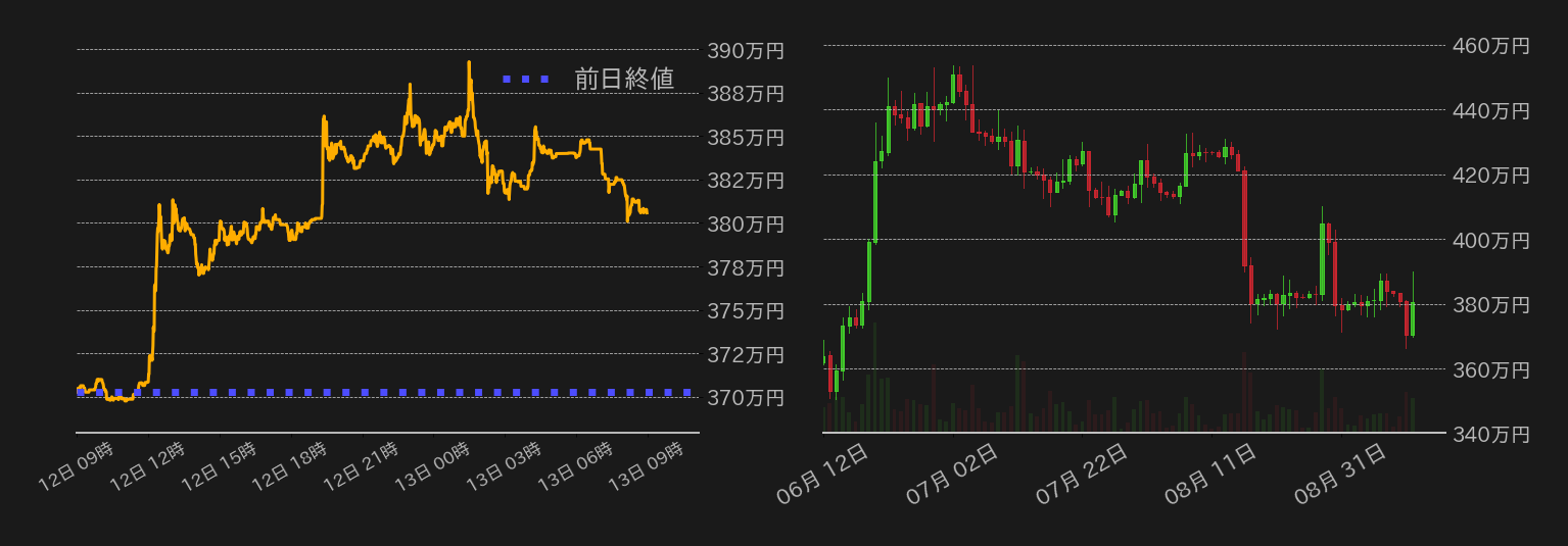 12日のビットコイン対円は、広範な金融市場で米インフレ指標への警戒感が強まるも、反発し前日の下げ幅を解消した。FTXによる資産売却の思惑から週明けの暗号資産(仮想通貨)市場は全面安で始まったが、BTCは25,000ドル水準(≒367.8万円)で下げ止まると、東京時間にはショートのロスカットを伴い380万円付近まで踏み上げた。欧州時間に入ると相場は380万円台中盤まで上伸し、米時間にはフランクリン・テンプルトンが現物ビットコイン上場投資信託(ETF)の申請を行ったこともあり、俄かに390万円にワンタッチした。一方、米株の軟化や、香港の取引所コイネックスへのハッキングが相場の重石となり、米時間から終値にかけてのBTC相場は海外時間の上げを掻き消した。
