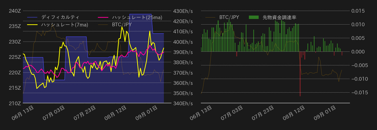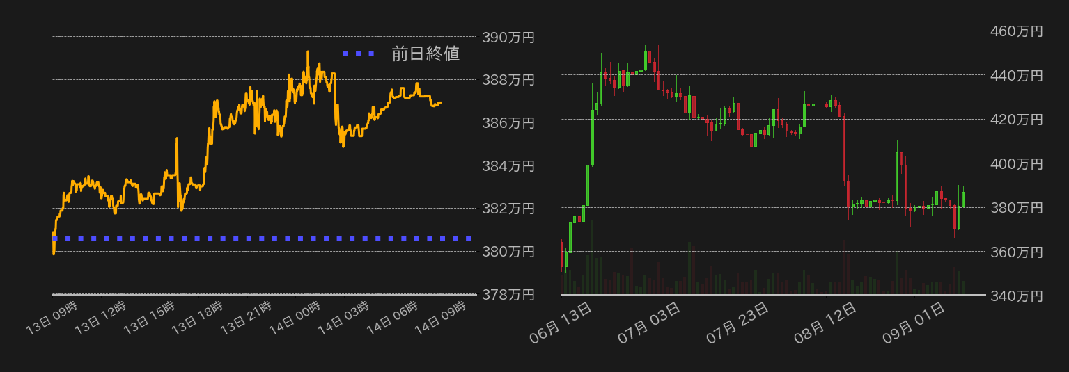 第1図:前日のBTC対円(左、1分足)と直近3カ月のBTC対円(右、日足)チャート 出所:bitbank.ccより作成