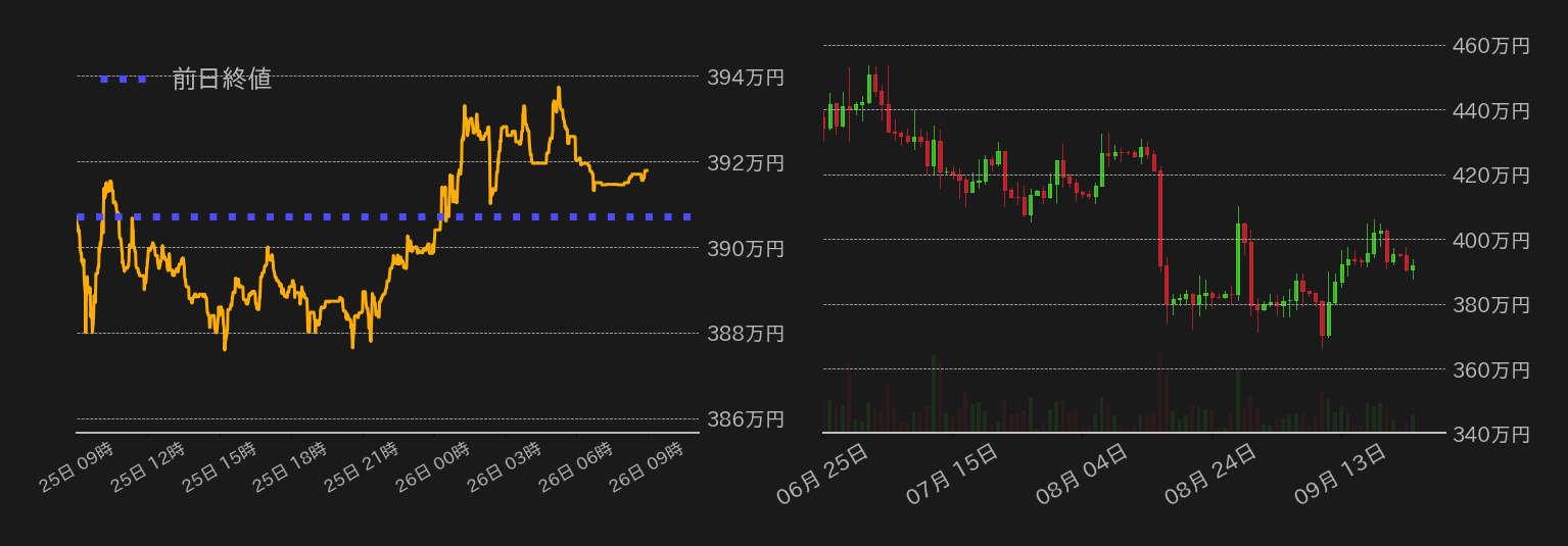 25日のビットコイン(BTC)対円は下げ渋り、終値は0.27%高と小幅に反発した。シカゴマーカンタイル取引所(CME)のBTC先物取引開始直後に394万円から390万円に急落したBTC円は、その後も上値の重い展開が続き、欧州時間に入ると26,000ドル水準(≒387.1万円)割れを窺う展開となった。一方、米市場序盤には、節目の水準で下げ渋ると、安寄りした米株に買い戻しが入り、BTCも反発。ただ、昨日は米国債利回りが反発し、指標10年物金利は15年ぶりの高水準まで上昇し、BTCは週末に相場のサポートとなった26,500ドル水準(≒394.6万円)にも届かず失速。終値ではプラス圏を維持したが、上値の重さも印象付けた。