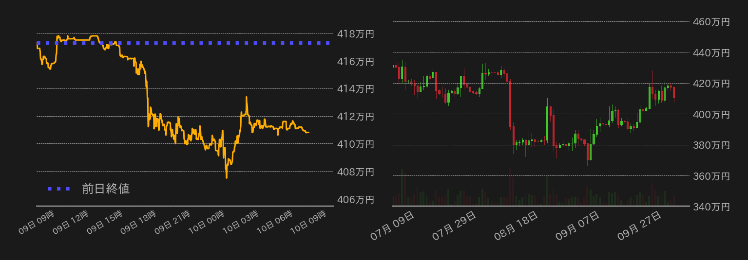 9日のビットコイン(BTC)対円は下落し、420万円乗せに失敗した。本邦が祝日だったこともあり、東京時間にBTCは418万円周辺で横ばいで始まったが、終盤に差し掛かるとXRP相場の下げに連れて410万円近辺まで値を下げた。その後はジリ安で410万円を割る場面もあったが、米時間にはローガン米ダラス連銀総裁が、米長期金利の上昇により追加利上げの必要性が低くなっていると発言し、BTCは下げ幅を縮小した。尚、週末に起きたパレスチナのイスラム組織ハマスによるイスラエルへの軍事攻撃開始を受け、中東情勢の悪化を背景とするエネルギー価格の上昇も確認されたが、BTC相場への影響は今のところ限定的と言え、逃避需要による金(ゴールド)価格の上昇や、ファンダメンタルズを重視した米株の上昇が相場の下値を支えた格好だ。