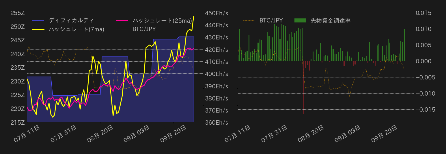 第2図:ビットコインのハッシュレート、ディフィカルティチャート(左)と先物資金調達率(右)チャート 日次 出所:bitbank.cc、Glassnodeより作成