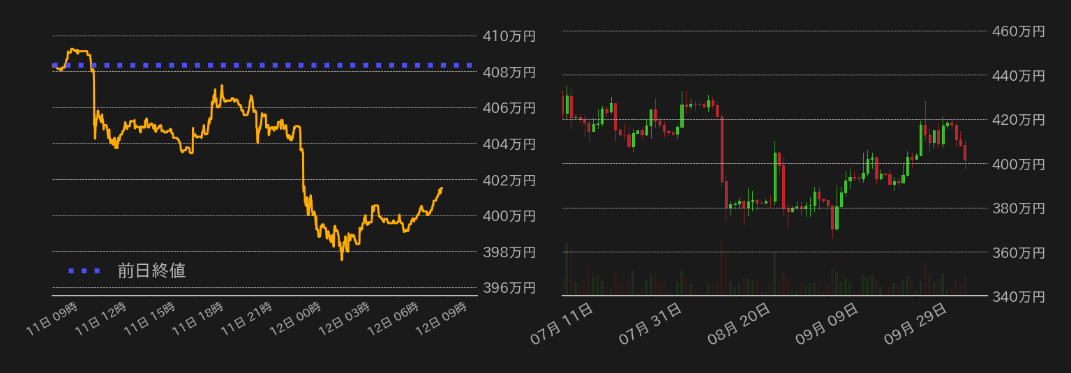 第1図:前日のBTC対円(左、1分足)と直近3カ月のBTC対円(右、日足)チャート 出所:bitbank.ccより作成