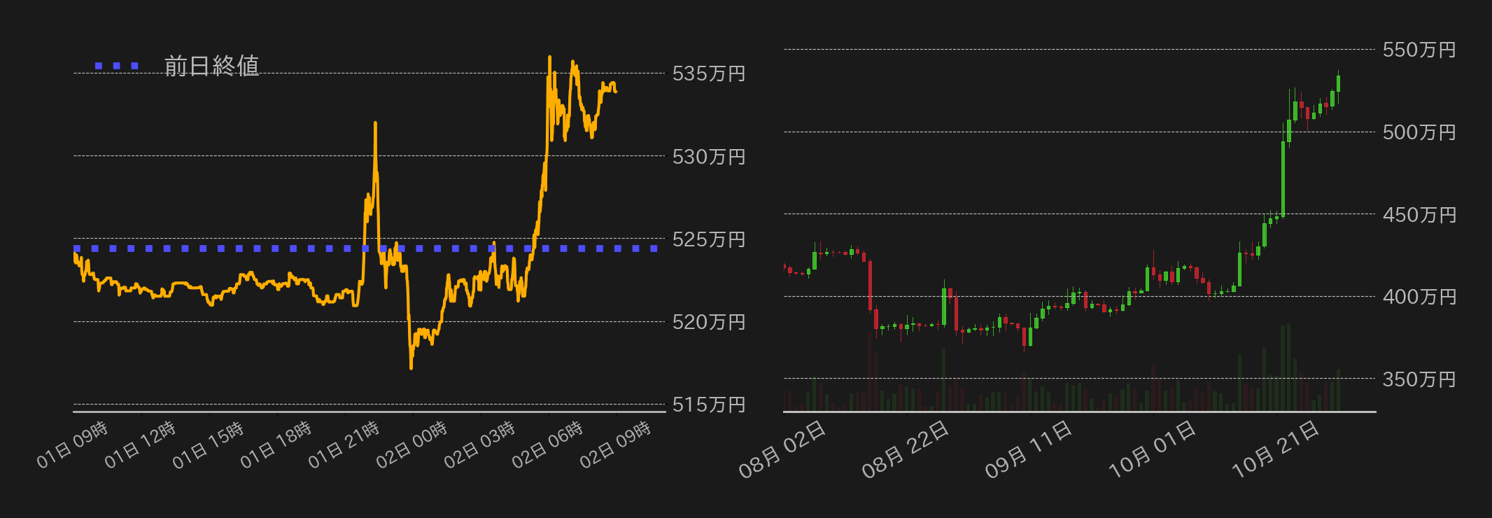 11月1日のビットコイン(BTC)対円は530万円台を回復し、年初来高値の526.6万円を更新した。この日の相場は524.3万円で取引を始めると、東京時間はジリ安となり、欧州時間序盤には522万円近辺で揉み合いとなった。その後、10月のADP雇用統計の下振れを受け、相場は一時530万円に乗せるも、米連邦公開市場委員会(FOMC)を控え伸び悩むと、9月のJOLTs求人件数の上振れを受けて517万円まで急落した。一方、この日発表された米製造業の指標が軒並み下振れたことで、相場は下げ幅を縮小。FOMCでは2会合連続で金利据え置きが決定された他、パウエル米連邦準備理事会(FRB)議長の姿勢軟化が窺えたことがハト派的と捉えられ、BTCは537.3万円まで急伸した。