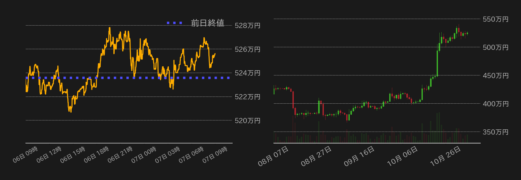 6日のビットコイン(BTC)対円は523.5万円で寄り付くと、東京時間は小幅揉み合いに概ね終始した。欧州時間に入ると、XRPがリップル社主催イベント「SWELL」を控えて急伸し、BTCも連れ高で527.8万円まで小高く推移した。一方、今週はパウエル議長を含め複数の米連邦準備理事会(FRB)高官の発言を控え米株式市場に様子見ムードが広がり、BTCも失速。さらにその後、金(ゴールド)に利益確定の売りが入り、BTCは上げ幅を縮小した。米市場引けにかけては米株が小締まる展開となったことでBTCも切り返し、終値ベースでは小幅に反発した。
