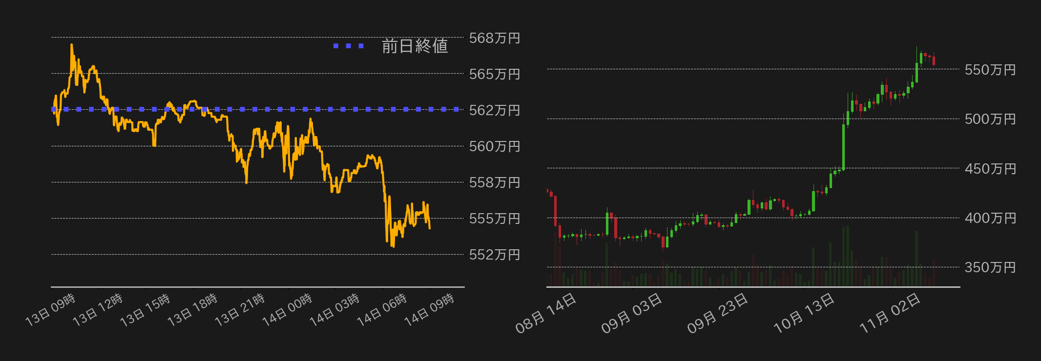 13日のビットコイン(BTC)対円は3日続落した。BTCは東京時間に上値トライに失敗すると、上値の重さが嫌気され下げに転じた。米時間序盤には、シカゴ・オプション取引所(Cboe)が現物BTCの証拠金取引とイーサ(ETH)の先物取引を1月に開始すると発表し、相場は560万円周辺で下げ渋ったが、直近で市場の上昇を牽引したソラナ(SOL)などのアルトコインが失速する中、上値も重かった。今朝方には、ブラックロックが米デラウェア州でXRPの信託登録を行ったとの報道が出たが、後に書類の提出者がブラックロックを装った別物と判明し、XRP相場が急反落すると、BTCも連れて550万円台中盤まで下落した。
