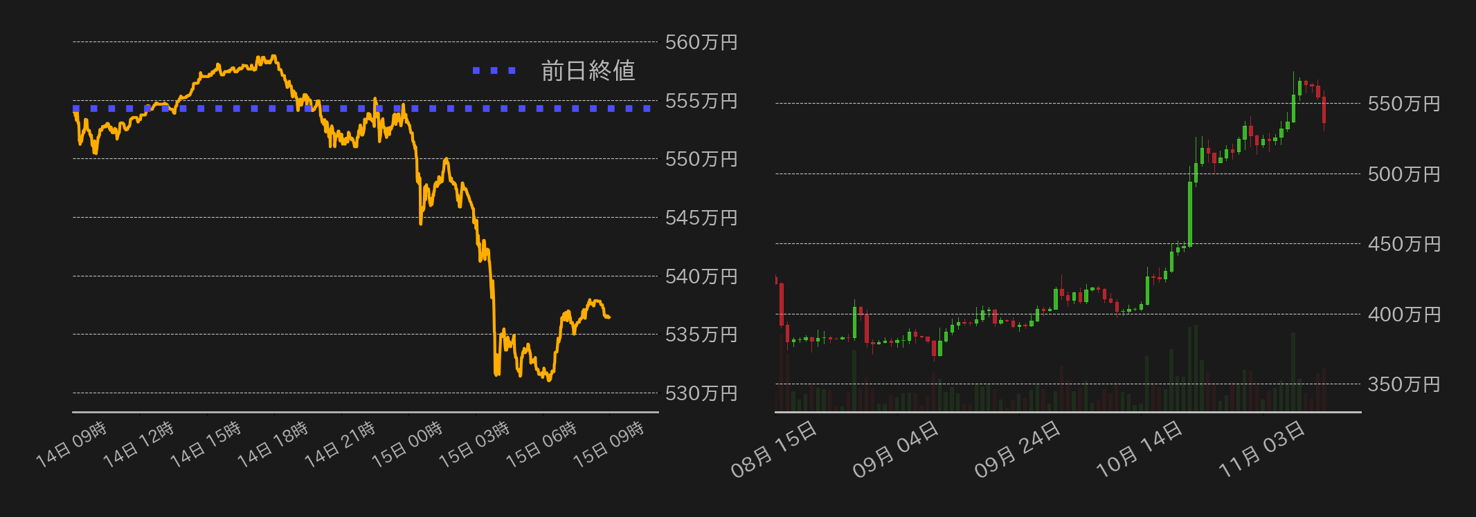 14日のビットコイン(BTC)対円は続落し、先週の上げ幅を大半を掻き消した。前日の下落の反動により、東京時間のこの日の相場は550万円からジリ高基調に終始するも、欧州時間に入ると戻り売りが入り、550万円台で揉み合う展開となった。その後発表された10月の米消費者物価指数(CPI)は、ヘッドラインとコア指数の双方が市場予想を下回る結果となり(3.3%→3.2%、4.1%→4.0%)、BTCは反発し、ドル建てでは短期でダブルボトムを形成したが、ネックラインに差し掛かると再び戻り売りが入り下げ足を速めた。米市場終盤にかけてのBTCは、ドル建てでは一時35,000ドル水準(≒527万円)を割り込んだ後に押し目買いが入り、円建てでは530万円を維持した。