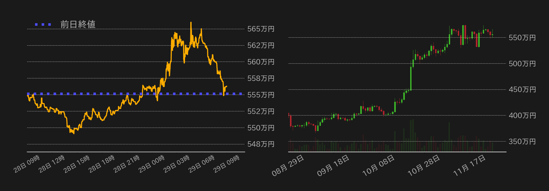 28日のビットコイン(BTC)対円は555.1万円で寄り付くと、取引材料に乏しく550万円周辺まで軟化した。一方、欧州時間に入ると相場は前日安値周辺で下げ渋り、米時間序盤にはS&Pケースシラー住宅価格指数の下振れによる米債利回りの低下を受けて555万円を回復。その後、米連邦準備理事会(FRB)ウォラー理事が向こう数ヶ月で利下げを開始できる可能性について言及すると、米債利回りは一層低下し、BTCは560万円台中盤まで急伸した。しかし、これによりBTCはドル建てで節目の38,000ドル(≒557.8万円)を回復すると、今朝方には利益確定売りが入り上げ幅をほぼ解消。ビットコインETFの早期承認期待で下げは限定されたが、終値での38,000ドル上抜けには失敗した。