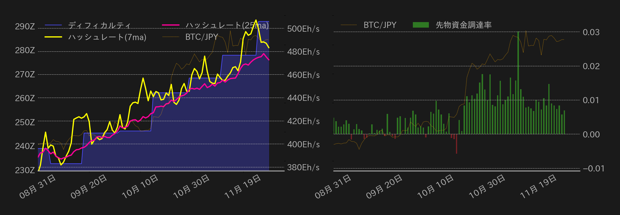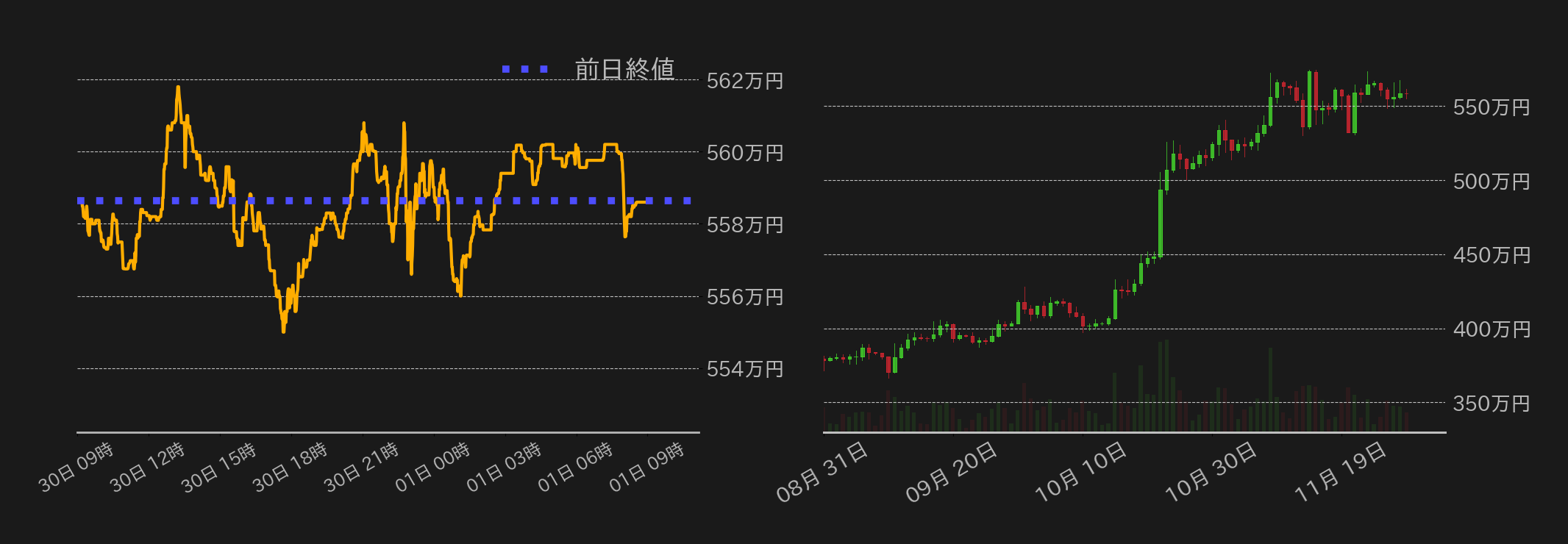 11月30日のビットコイン(BTC)対円は概ね550万円台後半で揉み合いに終始した。東京時間のBTCは一時38,000ドル水準(≒561万円)を回復したが、米国での規制取締り強化懸念やドル高が相場の重石となり、その後は下げに転じた。欧州時間には一部アルトコイン相場の上昇に連れ高となるも、米国債相場の反動安(利回りは上昇)や、米連邦準備理事会(FRB)高官らによる市場の早期利下げ観測を牽制する発言がBTC相場の上値を圧迫。この日発表された米個人消費支出(PCE)価格指数は2021年3月ぶりの低水準に鈍化したものの、BTC相場への影響は軽微だった。高値揉み合いが続くBTCだが、11月はドル安円高の影響を受けつつも、月足は+6.52%と3連騰を記録した。