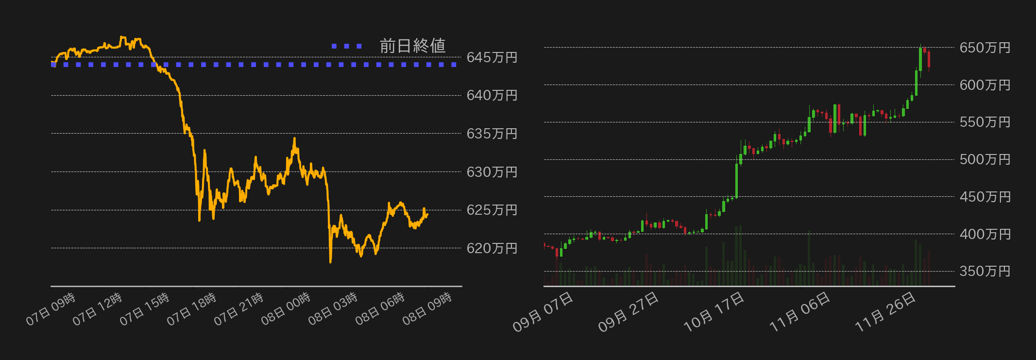 7日のビットコイン(BTC)対円は続落し、5日の上げ幅をほぼ解消した。この日のBTCは650万円近辺での揉み合いで始まると、日銀の金融政策修正観測が台頭したことによるドル円相場の急落が相場の重石となり、東京時間終盤には640万円近辺まで押した。取引材料に乏しい状況で海外時間にはドル建てBTCも1,000ドルほど下げたことで、BTC円は一気に630万円も割り込んだ。その後は43,000ドル水準(≒616.3万円)で下げ止まるも、米時間には米債利回りが低下したことでドル円相場の下落に再び拍車が掛かり、BTC円は620万円周辺まで一段安を演じた。一方、BTCドルは43,000ドルをサポートに底堅い推移に終始した。