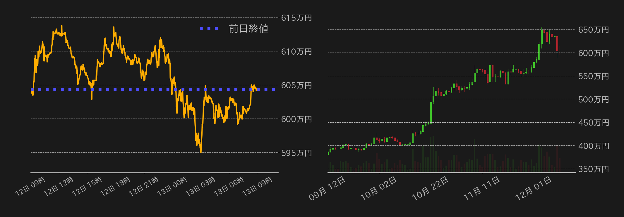 12日のビットコイン(BTC)対円は上下に振れるも、終値ベースではほぼ変わらずだった。東京時間のこの日の相場は、前日の急落から押し目買いの様相で反発して始まるも、ドル建てで42,000ドル水準となる614万円周辺が相場のレジスタンスとなり、その後は610万円を挟み込み揉み合いに終始した。しかし、その後11月の米消費者物価指数(CPI)が発表されると、BTCは下げに転じ、一時は600万円を割り込んだ。米CPIはほぼ市場予想と合致したが、前月比では若干伸びが加速し、米債利回りはCPI発表直後に急反発となった。一方、この日は米株が堅調な推移となったことで、米時間終盤にかけてBTCは買い戻され、終値では600万円を維持した。