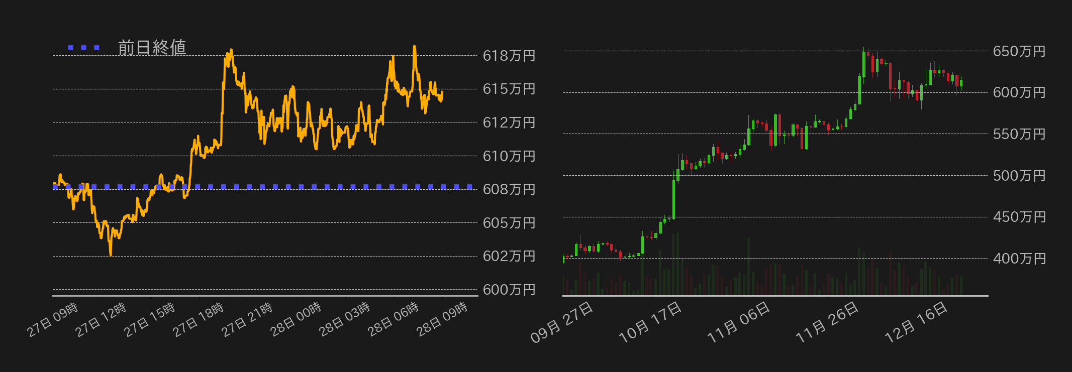 27日のビットコイン(BTC)対円はアルトコイン相場の復調に連れ高となり、前日の下げ幅をほぼ奪回し、終値で610万円を回復した。取引材料に乏しい中、東京時間のこの日の相場は小甘く推移し、一時は600万円近辺まで押したが、その後はイーサ(ETH)やビットコインキャッシュ(BCH)など、これまで失速していた主要アルトコイン相場が急伸し、BTCは610万円の上抜けに成功した。米時間序盤には、43,000ドル水準(≒612万円)を挟み込み一時は揉み合ったが、主要アルトコイン相場が上値を伸ばす中、BTCも底堅い推移となった。ただ、円建てBTCは米国債利回りの低下に伴う外国為替市場でのドル円相場の下落が上値を抑制する要因となり、上昇幅は限定された。