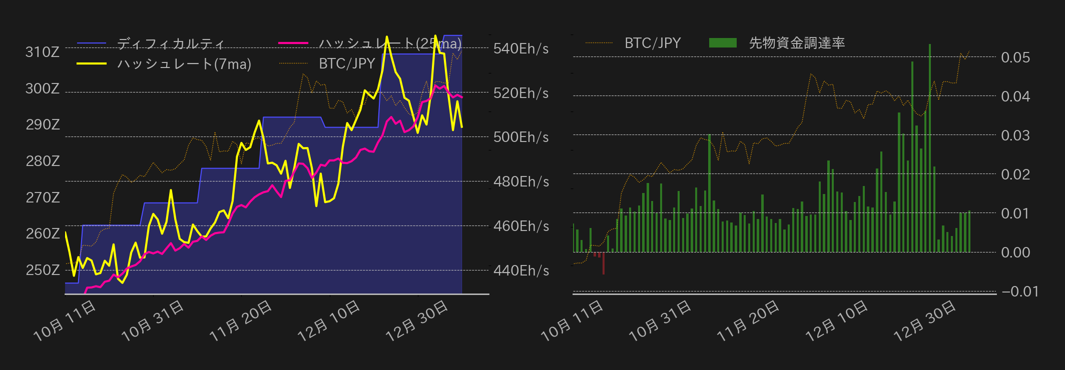 第2図:ビットコインのハッシュレート、ディフィカルティチャート(左)と先物資金調達率(右)チャート 日次 出所:bitbank.cc、Glassnodeより作成