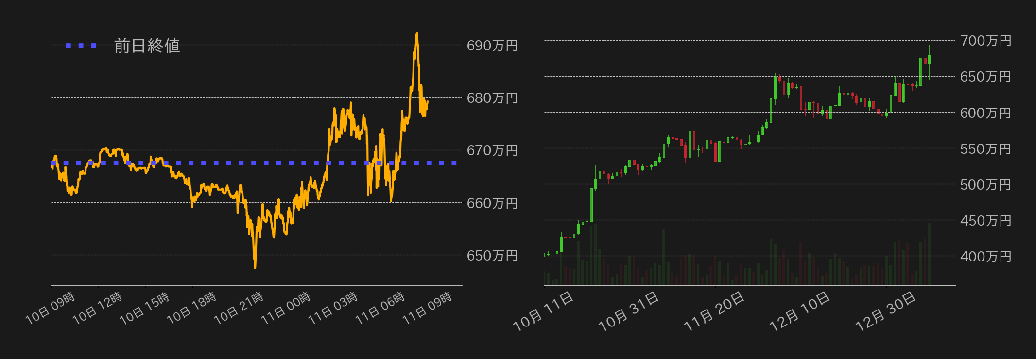第1図:前日のBTC対円(左、1分足)と直近3カ月のBTC対円(右、日足)チャート 出所:bitbank.ccより作成