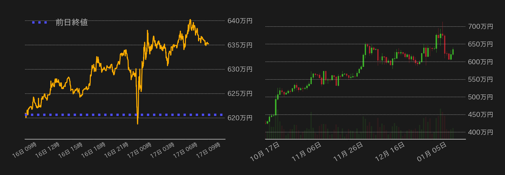 16日のビットコイン(BTC)対円は小確りと推移し、2日続伸。相場は先週末にレジスタンスとなっていた43,000ドル水準(≒633.7万円)を終値で回復した。米国での現物ビットコイン上場投資信託(ETF)取引開始に伴う事実確定売りが一巡したことで、BTCは週明けから底堅い展開となり、この日の東京時間もジリ高基調が続き、海外時間には630万円を回復した。米時間に入ると、1月分のNY連銀製造業指数の大幅な下振れを受けて相場は一時上下に振れるも、イーサ(ETH)相場の上昇や、米連邦準備理事会(FRB)の早期利下げ観測後退に伴うドル高円安がBTC円の支援となり、今朝方には640万円にタッチした。その後はやや上げ幅を縮小するも、43,000ドル水準はギリギリ死守している。