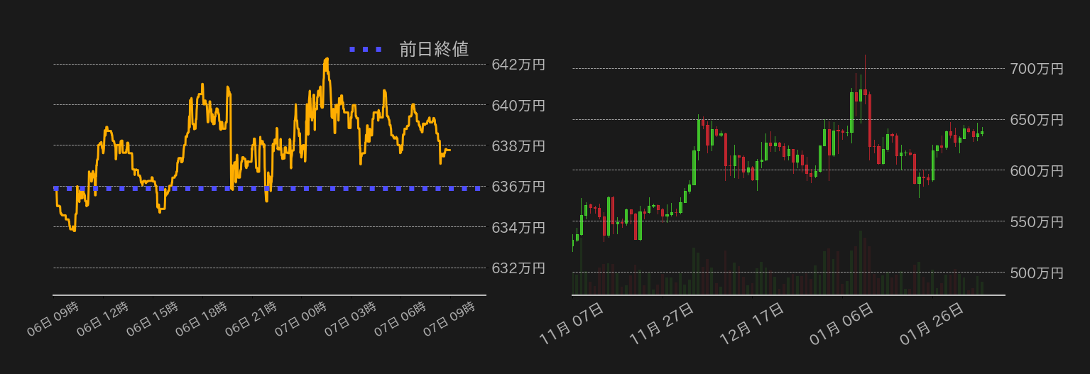 6日のビットコイン(BTC)対円は635.8万円からジリ高で戻りを試す展開で始まると、ドル建てで43,000ドル水準となる640万円周辺で上値を抑えられた。海外時間に入ると、ソラナ(SOL)のネットワーク停止に伴うSOL相場の下落に連れ安となるも、テストネットでのアップデートが順調に進むイーサリアム(ETH)が堅調に推移したことでBTCも持ち直し、米国時間序盤にはドル建てで43,000ドルを回復した。一方、その後は米クリーブランド連銀のメスター総裁が、「利下げ時期を発表できる準備はできていない」と発言したことでBTCは失速。米株の反発や米国債相場の反動高で相場の下値は堅かったが、ドル円相場の反落が円建てBTC相場の重石となり、終値での640万円維持には失敗した。ただ、終値では何とかプラス圏を維持し、637.7万円で引けた。