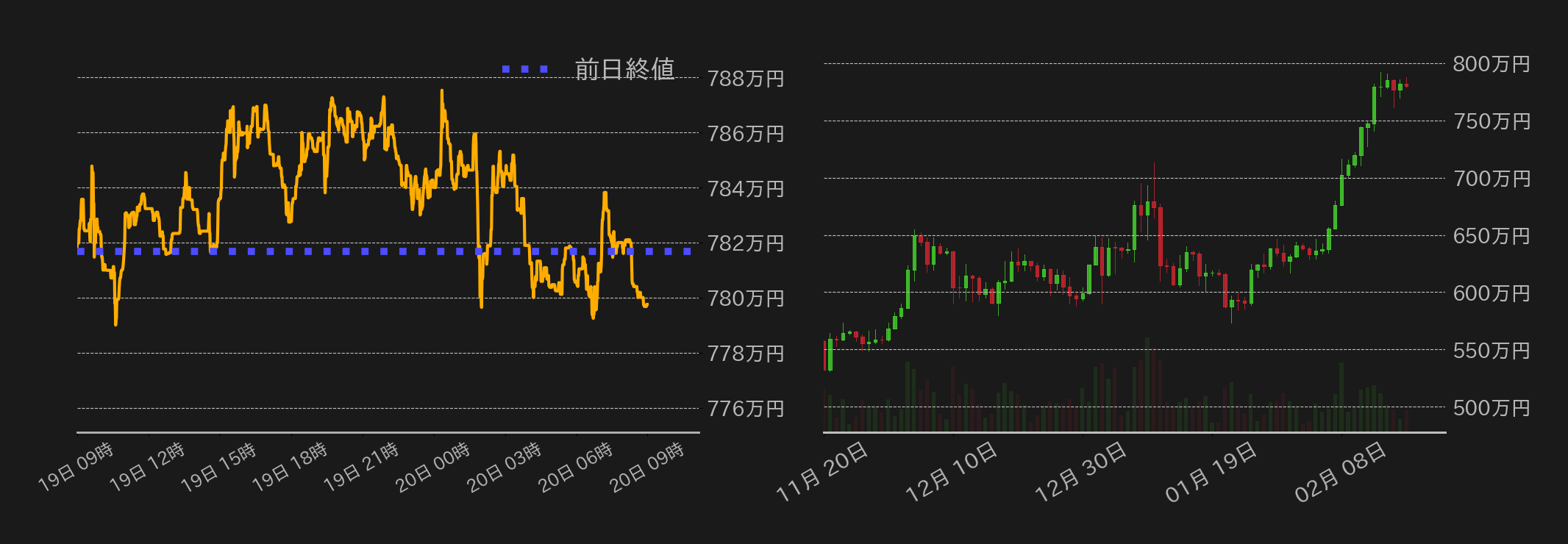 第1図:前日のBTC対円(左、1分足)と直近3カ月のBTC対円(右、日足)チャート 出所:bitbank.ccより作成