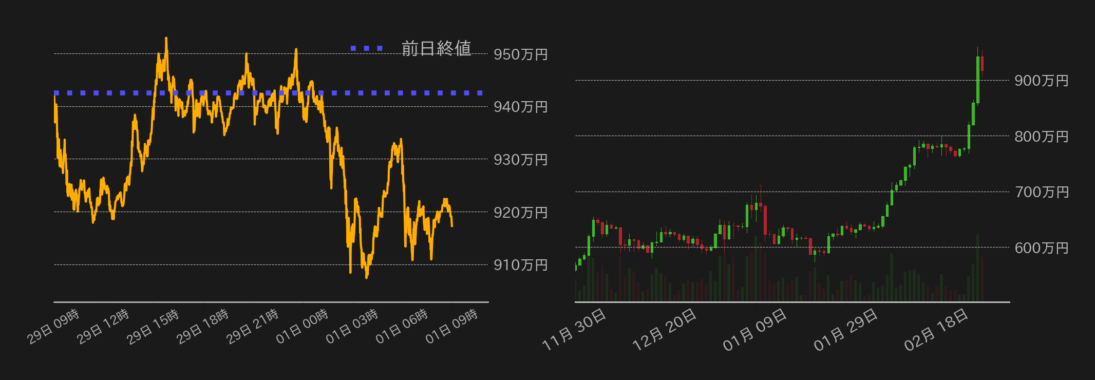 2月29日のビットコイン(BTC)対円は反落し、連騰記録は六日間で止まった。この日のBTCは942.5万円から小甘い推移で始まるも、前日のブラックロックのビットコインETFへの資金流入が初めて6億ドル(≒901億円)を超えたことが明らかとなると、反発して前日終値を回復した。一方、その後の相場は伸び悩み、940万円周辺で揉み合いに転じた。米時間に入ると、1月の米個人消費支出(PCE)価格指数が市場予想と完全に合致したことや、新規失業保険申請件数が上振れたことで、BTCは一時上値を試すも、高値警戒感からか上値を圧迫された。すると、米時間中盤にかけては見切り売りが入り、相場は940万円周辺から30万円ほど押した。終盤にかけては買い戻しが入るも、戻りは鈍く、終値は25.2万円安の917.2万円となった。