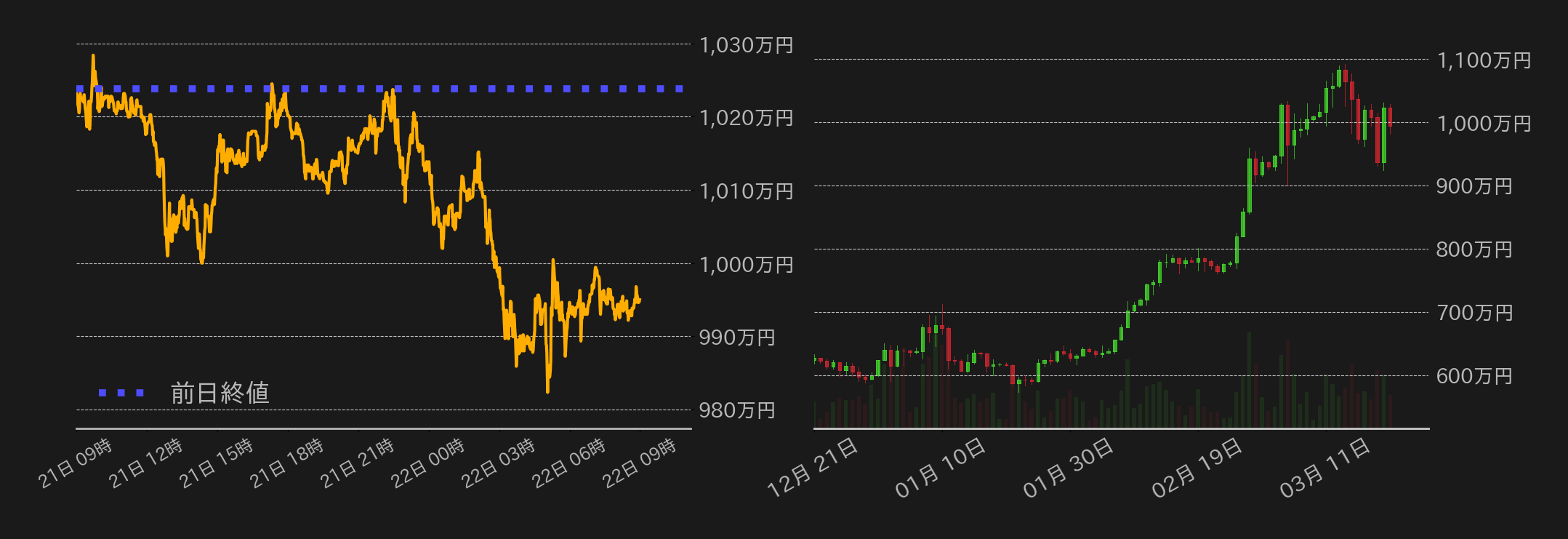 21日のビットコイン(BTC)対円は反落し、終値は1000万円の維持に失敗した。前日は923.8万円から1030万円まで大幅反発したBTC円だったが、この日はドル建て68,000ドル水準(≒1031万円)で上げ渋っていると、戻り売りが入り1000万円近辺まで反落した。その後は節目で反発するも上値は重く、米時間には米新規失業保険申請件数が強めに出たことや、CBの景気先行指数が2年ぶりに上昇したことで、米債利回りが上昇しBTC円はやや軟化。さらに、この日はイーサリアムL2のブラスト上のブロックチェーンゲームで、トークンが不正に発行されるハッキングが起こったことも嫌気され、相場は1000万円を割り込み、65,000ドル水準(≒985.5万円)近辺まで押した。