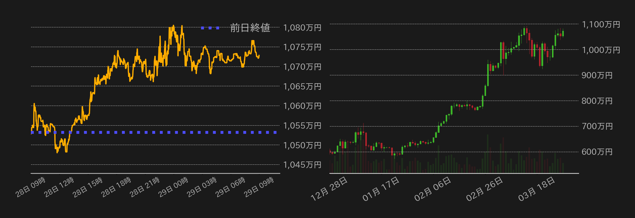 28日のビットコイン(BTC)対円は反発し、相場は一時今週の高値1084万円周辺まで戻した。この日の相場は70,000ドル水準(≒1060万円)を背に小さく揉み合いで取引を始めると、前日にブラックロックのETFに平均値を超える資金流入があったことや、SECとコインベースの裁判継続の報を消化し、アルトコインが反発したことで、東京時間終盤から欧州序盤にかけて70,000ドル水準を上抜け1070万円を回復した。米国時間には、米ミシガン大が発表した3月の5年先のインフレ期待が2.9%から2.8%に低下したことを受けて、BTC円は1080万円台に乗せたが、その後FRBのウォラー理事が利下げを遅らせる可能性に言及し、1070万円台に下落。幸い、米株式市場は明日のPCEの発表を控えて様子見となったことで、その後はBTC円も底堅い推移が続いた。