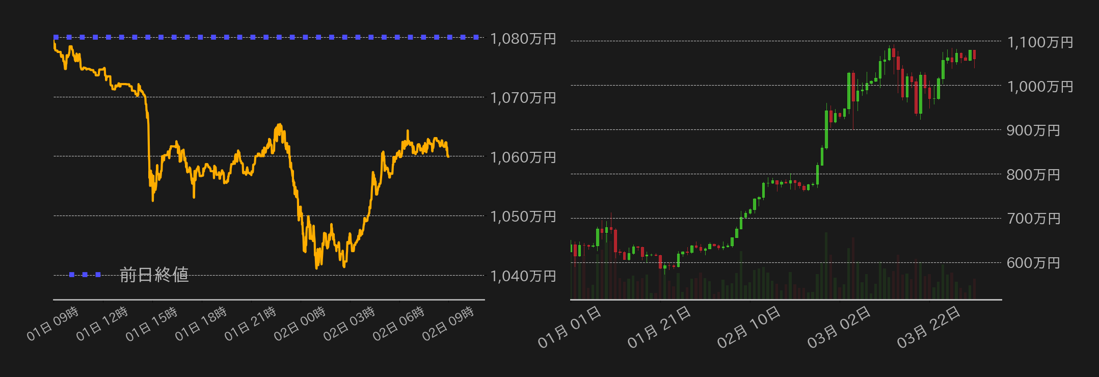 4月1日のビットコイン(BTC)対円は反落し、前日の上げ幅を解消した。この日の相場は1079.9万円から小甘い展開で始まると、取引材料に乏しい中、東京時間終盤には週末に蓄積されたロングポジションの大半が清算され、相場は1050万円近傍まで急落。その後は1060万円周辺での揉み合いが続いたが、全米供給管理協会(ISM)が発表した3月の製造業購買担当者景気指数(PMI)が50.3と上振れ、1年半ぶりに景気拡大と縮小の閾値となる50を超えたことで、米債利回りが急反発し、BTCは1039万円までさらに下落した。一方、これによりロングポジションが捌けると、相場は反発し米時間序盤の下げ幅を解消し、1060万円周辺まで戻した。