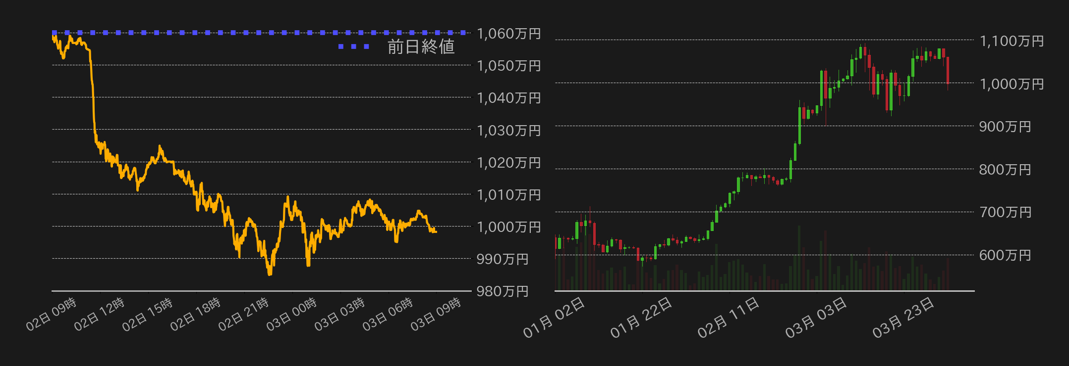 2日のビットコイン(BTC)対円は俄かに大幅続落となり、10日ぶりに1000万円を終値で割り込んだ。東京時間のこの日の相場は大きな売りが入ったことで、ロングの投げを伴って下値を模索する展開となり、1060万円周辺から1010万円近辺まで急落した。その後も相場は上値の重い展開が続き、テスラの納入台数低下を受けた米株の下落や、米政府がシルクロードから押収した約3000億円のビットコインの内、200億円分がコインベースに送金されたことが嫌気され、BTC円は米時間序盤にかけて1000万円を割り込み983.5万円まで下落した。ただ、その後は安寄りした米株が上昇したことでBTC円も底堅い推移となり、終値では998.2万円まで戻した。