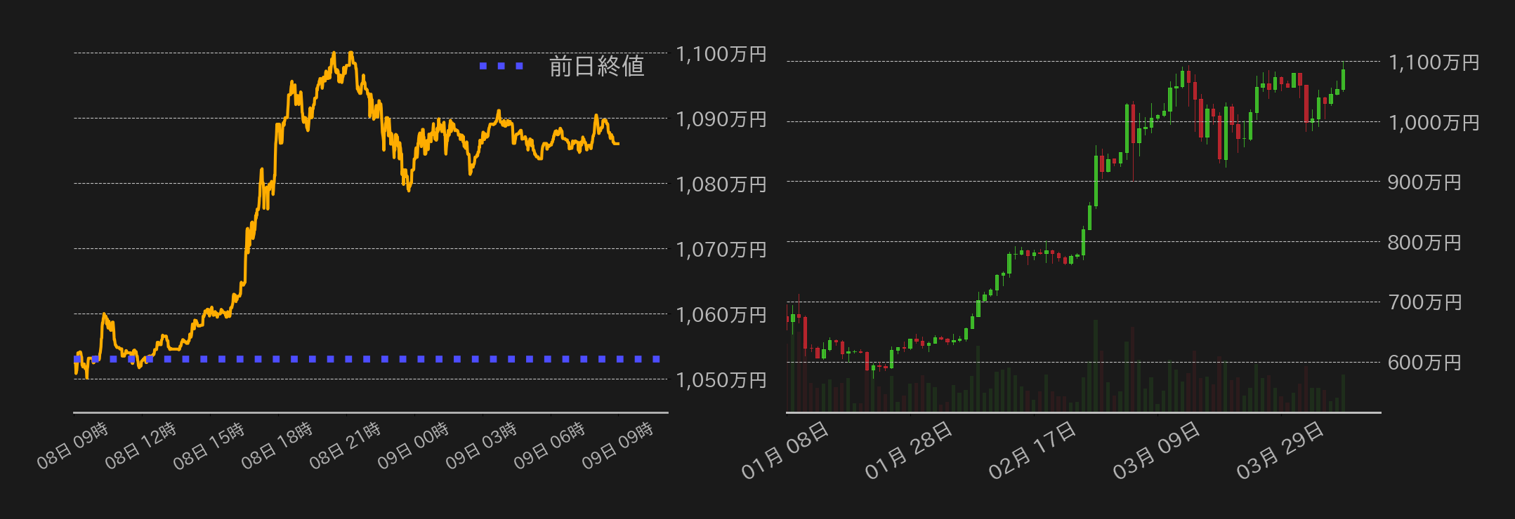 8日のビットコイン(BTC)対円は続伸し、1100万円の高値を付け史上最高値を更新した。来週に半減期を控える中、BTCのドル建て相場は三角保ち合いからのブレイクアウトが意識される水準でこの日の取引を始めると、東京時間終盤からはジリ高に転じ、海外時間に入ると上値を追う展開となり、保ち合い上抜けに成功。また、この日は東証上場のメタプラネットが10億円分のBTC購入を取締役会で決議したと発表したことも好感され、BTC円は史上最高値を更新し、米時間に入るまでに1100万円にタッチした。その後は金相場の失速とドル高を眺め1080万円まで上げ幅を縮小したが、明日の米消費者物価指数(CPI)の発表を控え米主要株価3指数が横ばいとなったことで、BTC円も下げ止まった。